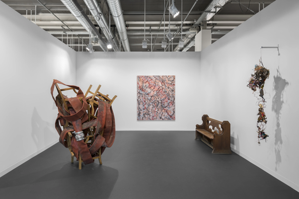 Also on view were works by Irma Blank, whose gestural language straddles drawing and writing; a selection of suede-based paintings by rising British artist Poppy Jones; and a contemplative new portrait by German painter Magnus Plessen. Making their Art Basel debut with Mai 36 were sculptures by Swiss artist Raphael Hefti, known for his alchemical processes with industrial materials, and Dutch artist Magali Reus, whose meticulously constructed forms blur the line between the familiar and the enigmatic