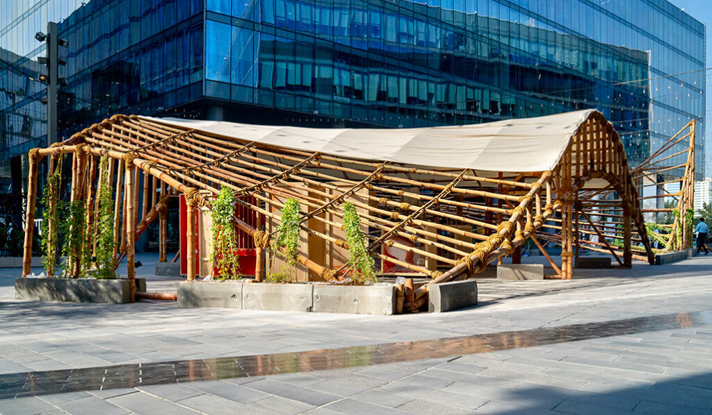 Abwab which translates to ‘doors’ in Arabic was a key feature of the Dubai Design Week programme. It is dedicated to commissioning work from across the Middle East, North Africa and South Asia to promote cultural exchange and young talent from the regions. The 2021 Abwab commission has been awarded to Dubai-based architect Ahmed El-Sharabassy for his proposal titled ‘Nature in Motion’. The architectural pavilion hosted an exhibition titled ‘Pulp Fusion’ curated by Beirut-based architecture and research firm Bits to Atoms. Students from Dubai Institute of Design and Innovation (DIDI) participated in demonstrations of the fabrication and assembly process of Abwab onsite, using locally sourced material provided.