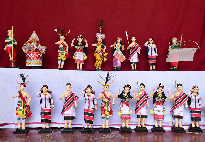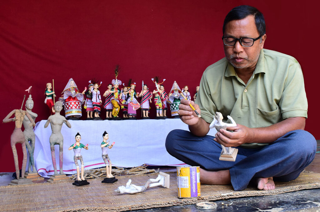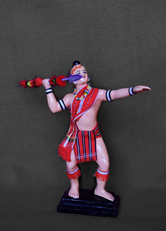 He elaborates his process: “At first, we insert wire inside the hollow of the straw for the doll’s malleability and then we use that to make the skeleton of the doll and use strong thread to bind the straws together. Then we stick cloth on the whole straw skeleton with gum which is made of flour. Once the glueing of the cloth is done, we place the doll on top of a pedestal. For the distinct bodily features of the doll, we make a concoction of clay and jute by cutting the jute into tiny pieces and mixing them with clay, and use it to make the distinct body parts of the doll, and then a thin cloth is glued over it, followed by the painting of the body and face using enamel paint. After the paint is dried, the doll is dressed.”Regarding the maintenance of these dolls, he insists on keeping the dolls away from moisture as they might cause damage to the dolls and the best way to preserve them is to keep them inside a glass box.He carries on the legacy of doll making from his father Tona Singh, who was a prominent doll maker and he has been the greatest influence for Konsam Ibomcha Singh’s practice.