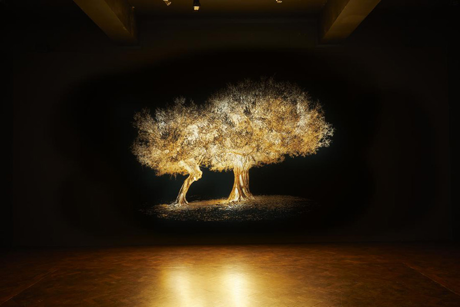 At first glance, the surreal golden Olive tree almost feels like a gateway to an enchanted forest. ‘Together’ by Prince Nikolaos is another immersive installation at the Biennale where the illuminated trees, followed by sound recordings from Greek’s natural habitat, creates an aura that abridges a route to mother nature. According to the artist, the pandemic has altered human relationships and encourages us to go back to our roots for inspiration. Consequently, the artist draws parallels between being one with nature and being one within us in this dimmed space, evoking a strong sense of stillness.