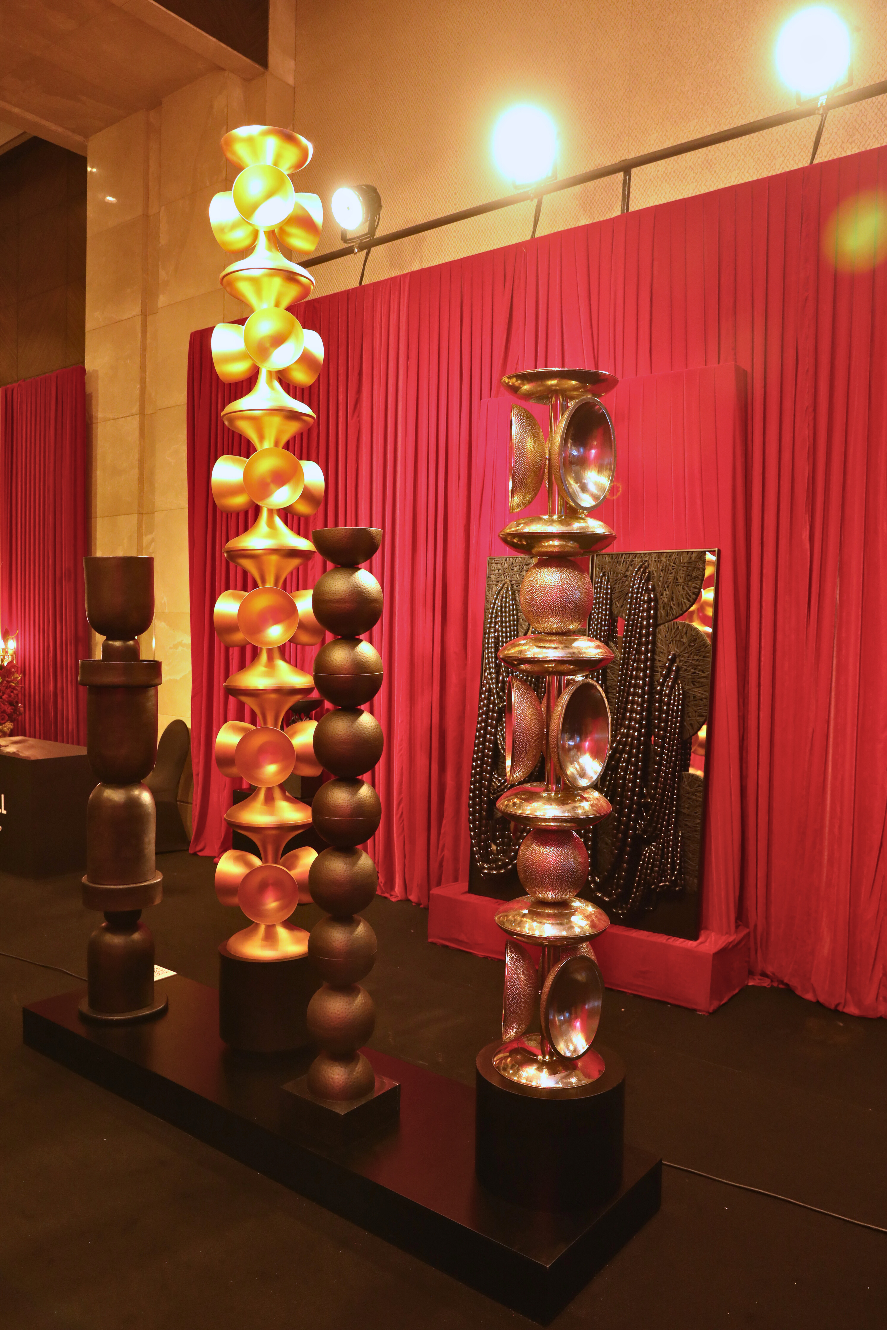 7) Ashiesh Shah, Kalaghoda, Glass, Silver Patra Stambh, Moonshadow, Copper Damrod Stambh, Multi-ball Brass Stambh, Kumbh Panel, Hand of Adam Dhoop Table, Longpi Vases, Atelier Ashiesh Shah