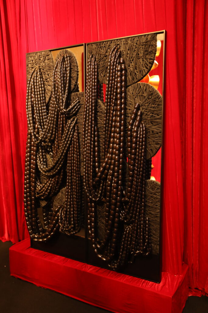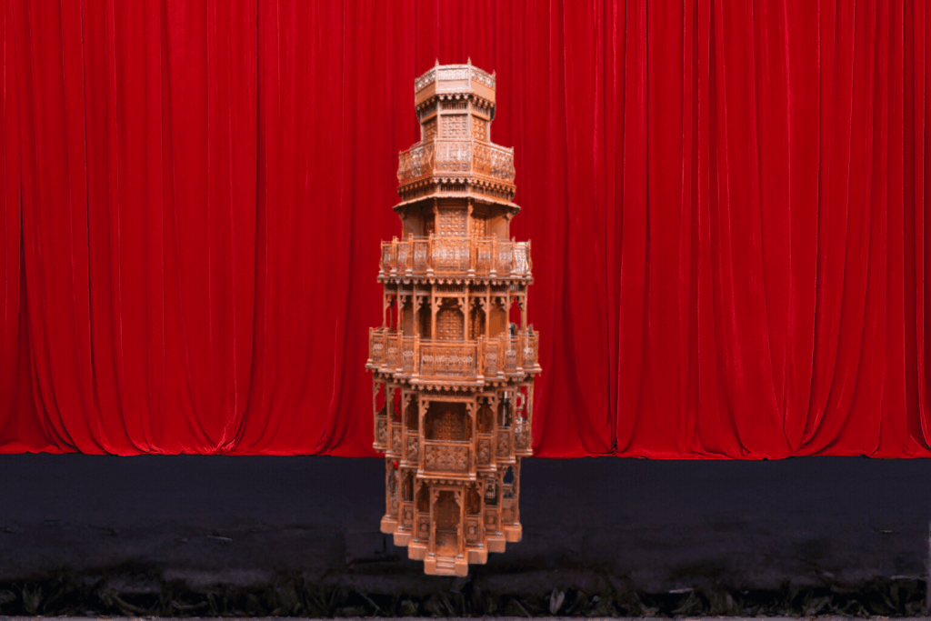 This five-part work rises like a vertical edifice, echoing the form of a five-storey building. Each tier functions as a chamber of memory and imagination, layered with lived experiences and inherited stories. Beyond its architectural presence, the structure asserts itself as a powerhouse, a totemic symbol of vitality that recalls the figure of the village head, an enduring anchor and source of collective strength.
